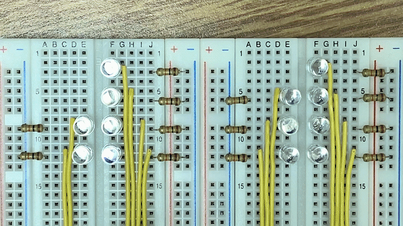 Thus, we will construct a four columns of LEDs on a breadboard (resembling the form of our Binary CLK, and then write a simple program the light up the LEDs using the Arduino UNO. While you work, keep in mind that we will port this over to an ATtiny4313 soon and for the final part - the Binary CLK.