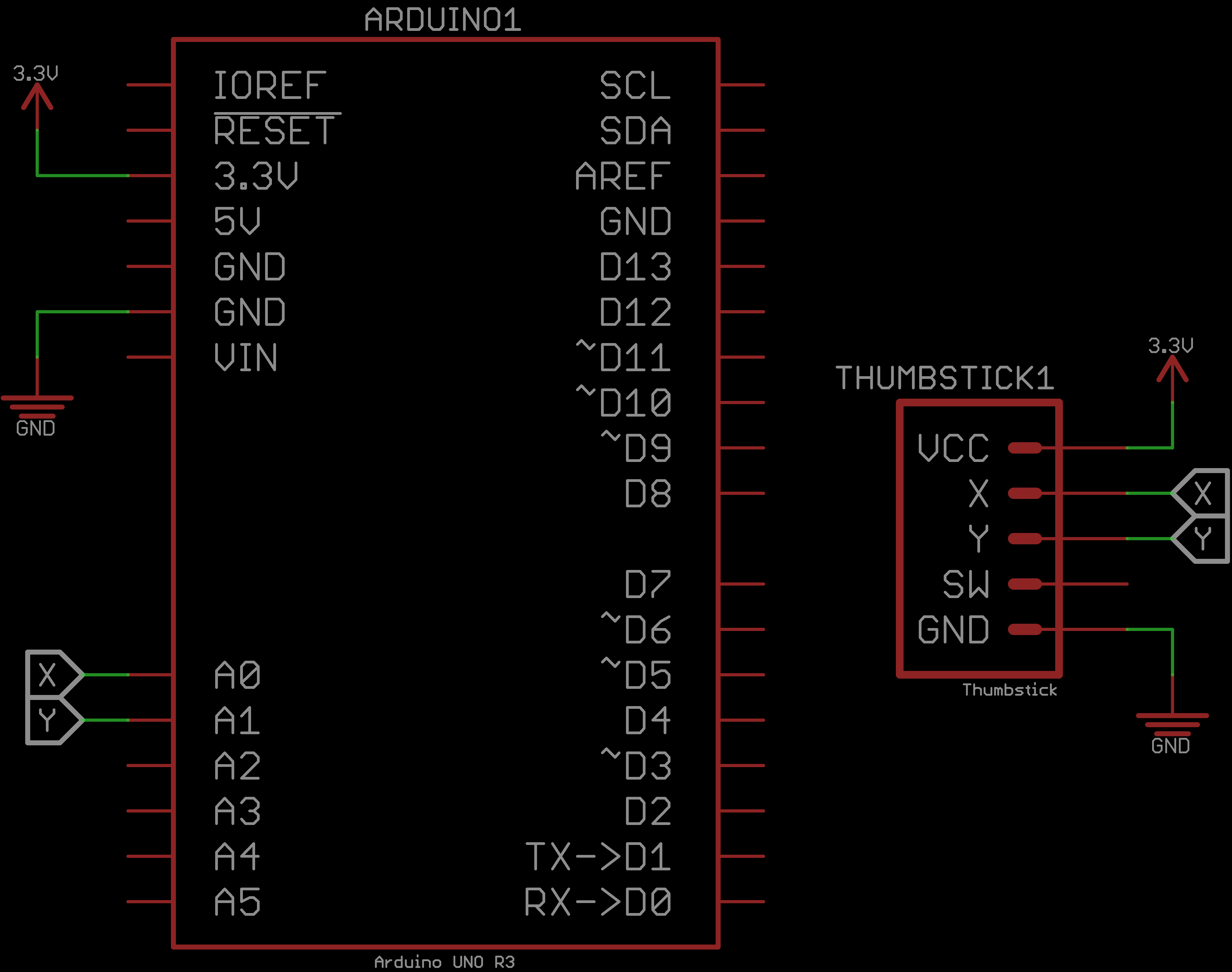 Let us make the circuit to play with the thumbstick. Construct the following circuit to connect the thumbstick to the Arduino UNO: