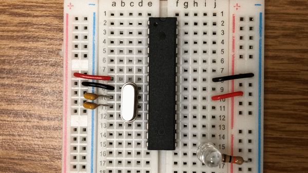 With the code given above, the ATMEGA328p will toggle one of the digital pins. The following circuit blinks an LED using the appropriate digital pin designated in the uploaded code: