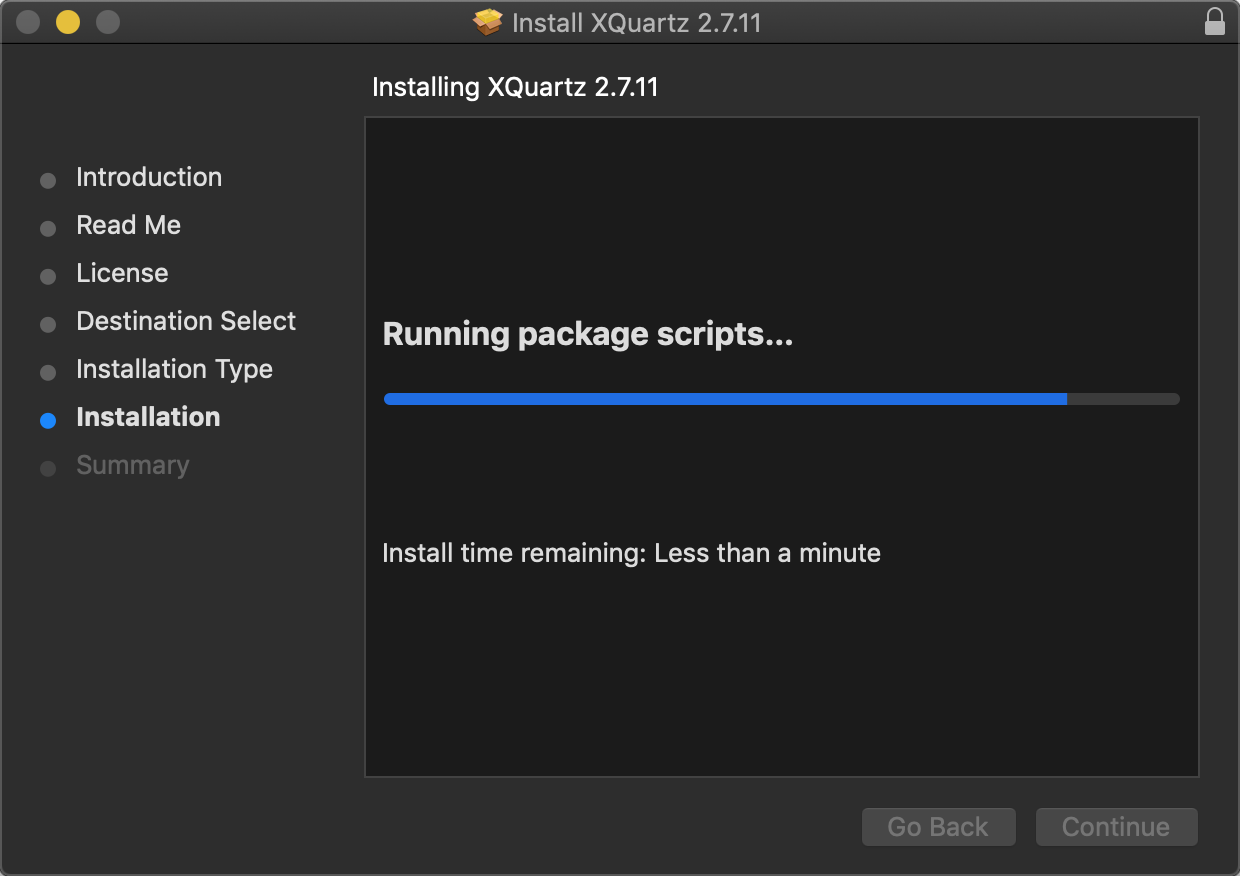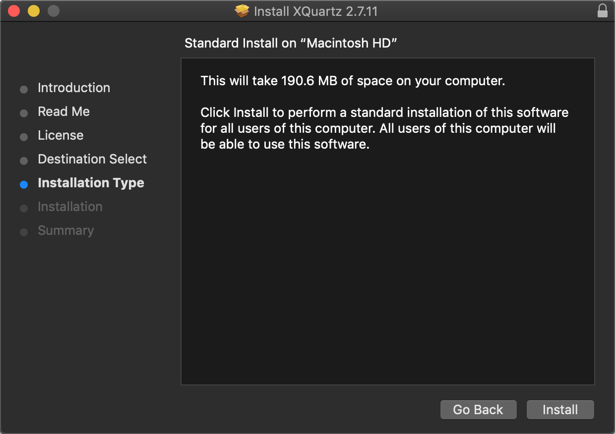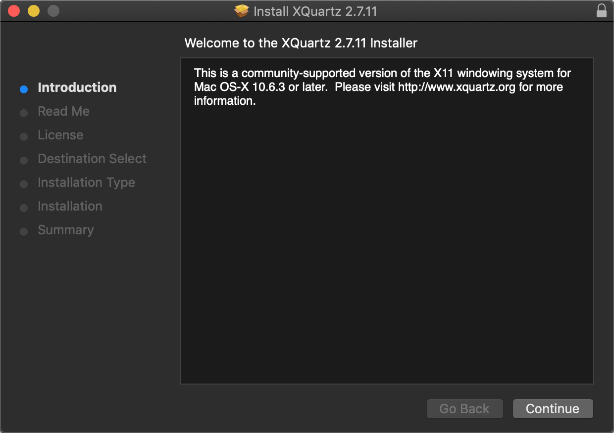 Click to install XQuartz. You may need to provide an administrative password to give the installer permission.
