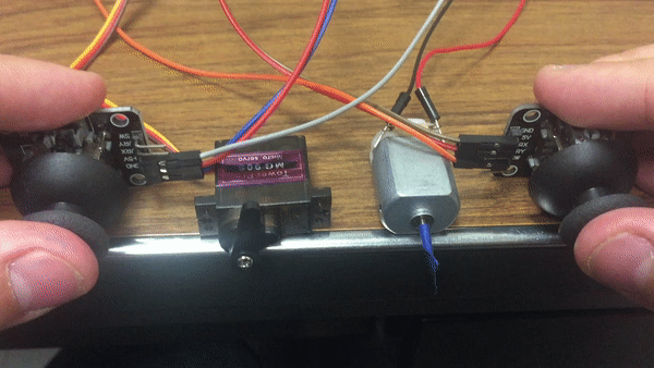 If you hear a high-pitched whirring sound when writing very low PWM values - this is normal. It means that the motor is stalled and is not good for the motor in general. When the motor is stalled it pulls a lot of current, that may cause the servo to bug out (even though we were very careful to isolate the motor and servo from each other).