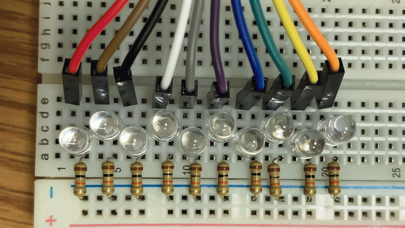 Construct a circuit to program 10 LEDs (with the appropriate corresponding resistors) using the ATtiny84. We recommend using the following pins (to match the PCB to come): 10, 9, 8, 7, 6, 5, 4, 3, 2, 1.