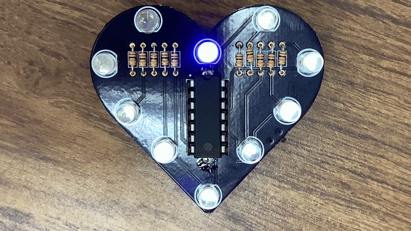The Heart CKT is a simple application of system on a chip design. (Also, an application of the ATtiny Programmer). We will be programming an AVR microcontroller, namely the ATtiny84, to light up 10 LEDs in a radiant lightshow.