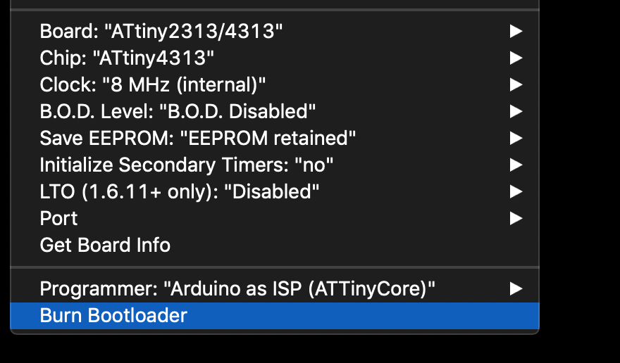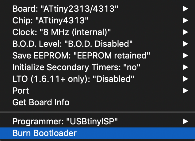 From hereon out, we will be using at ATtiny4313 to demonstrate the bootloading process. We will still mention ATtinyX313 where it is general, but configure the appropriate settings for the ATtiny4313. However, this same process can be applied to any of the ATtinyX313 variants, given that you make the appropriate change at the Chip selection shown later.