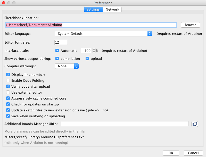 Click OK to exit both the Additional Boards Manager URL pop-up window and the Arduino Preferences and return to the Arduino IDE.