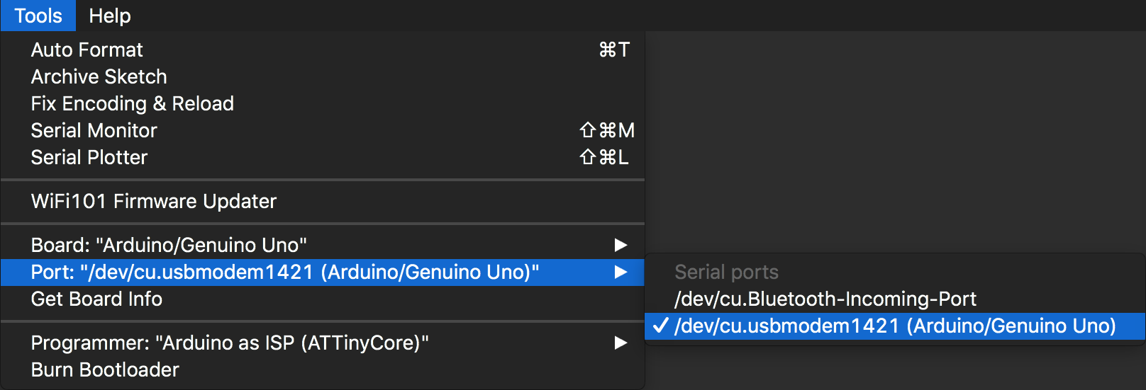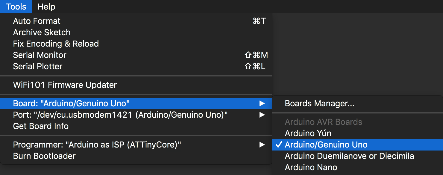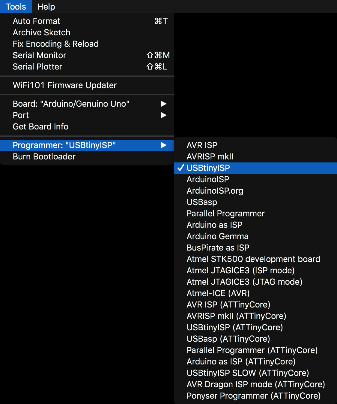 The Programmer is important, and is subtle – easy to forget when programming these MCUs. This tells the Arduino IDE how to behave when uploading your program (to the Arduino UNO, ATtiny, etc.).