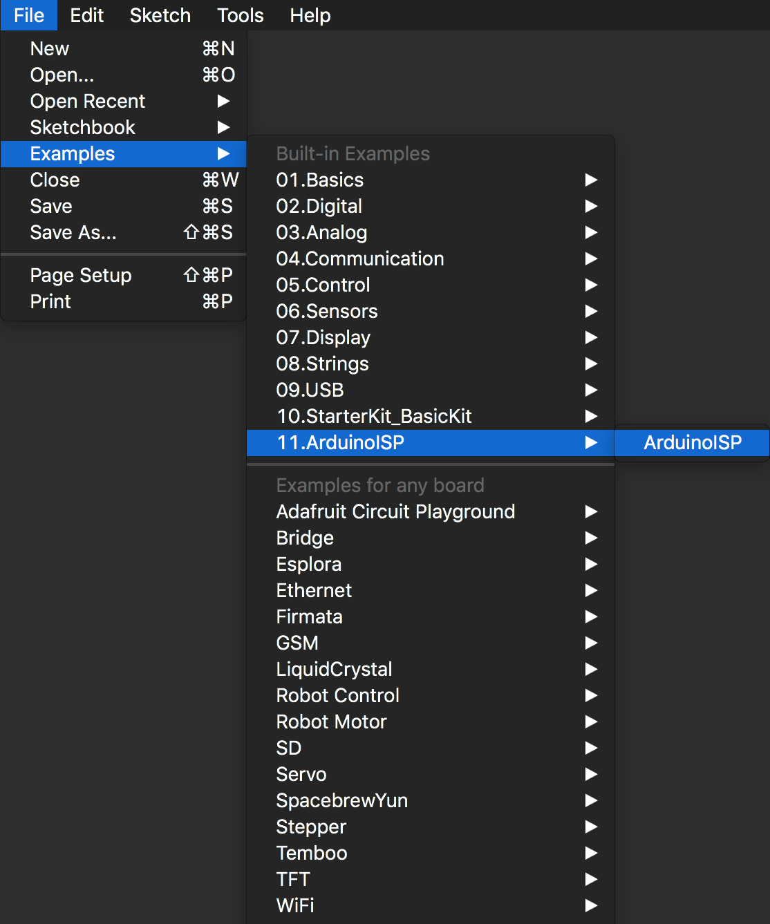 Launch the Arduino UNO IDE. Navigate through File > Examples > 11.ArduinoISP and select the ArduinoISP sketch.