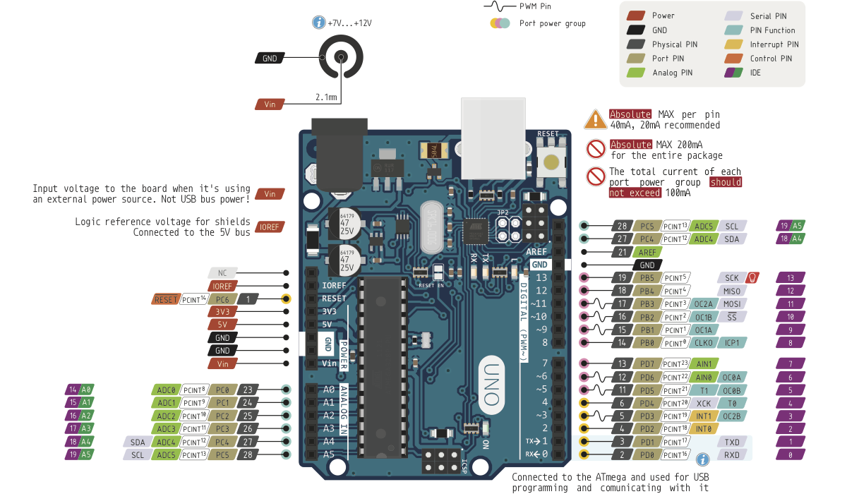 The following diagram illustrates the Arduino UNO R3 pinout for reference: