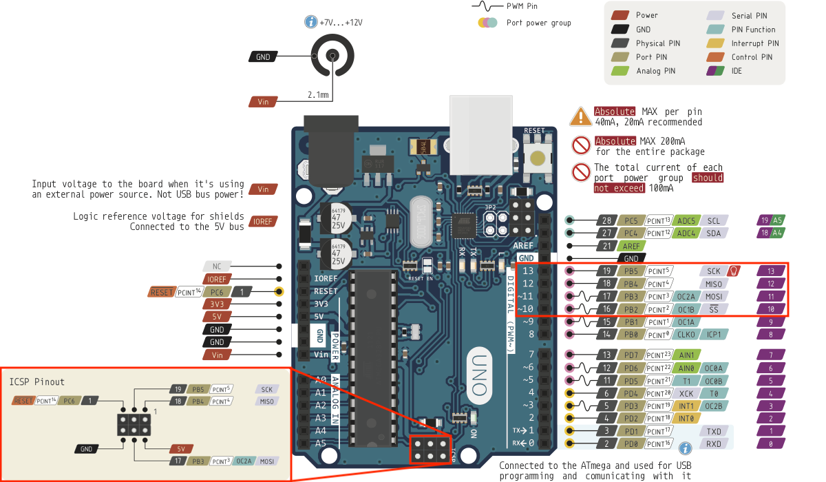 Find these pins on the Arduino UNO pinout diagram below and be aware of their location on your Arduino UNO and other AVR microcontrollers. In the same diagram, we highlight the In Circuit Serial Programmer (ICSP) header. This header appears in many AVR microcontroller development boards. It is a standardized interface for bootloading and programming AVR microcontrollers.