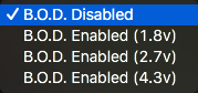Brown-Out Detection (B.O.D.) Level is the trigger voltage for Brown Out Detection. B.O.D. continuously monitors VCC, and below the chosen B.O.D. voltage level, the ATtiny will be held in the reset state. That is, when the voltage across the ATtiny drops below the set threshold, and thus becomes insufficiently powered, the voltage may be too low to reliably run at the set clock speed.