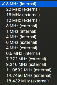 Observe that there are options for internal and external clock rates. The ATtiny as a standalone microcontroller will support any of the internal clock speeds. If you wish to run the board faster, at one of the listed external clock rates, you will need to attach a(n) (physical) external crystal oscillator to the ATtiny.