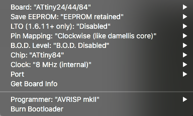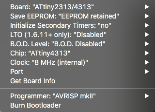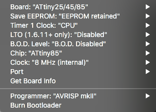 Then navigate to Tools and observe the selected ATtiny board settings. The following image shows the settings for each of the aforementioned ATtiny variants.
