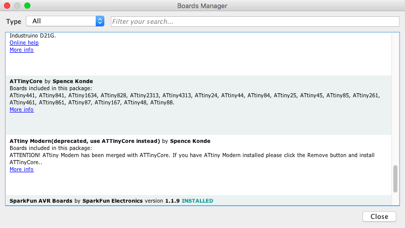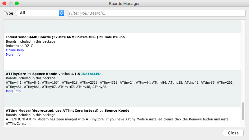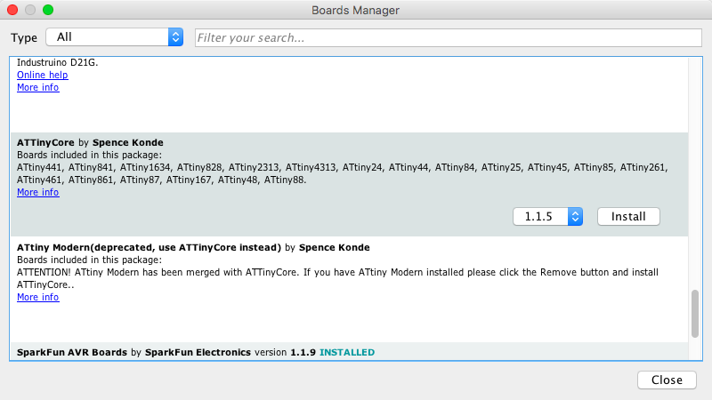 After several seconds, the boards will be installed. The row for ATtinyCore by SpenceKonde should now display the current version installed.