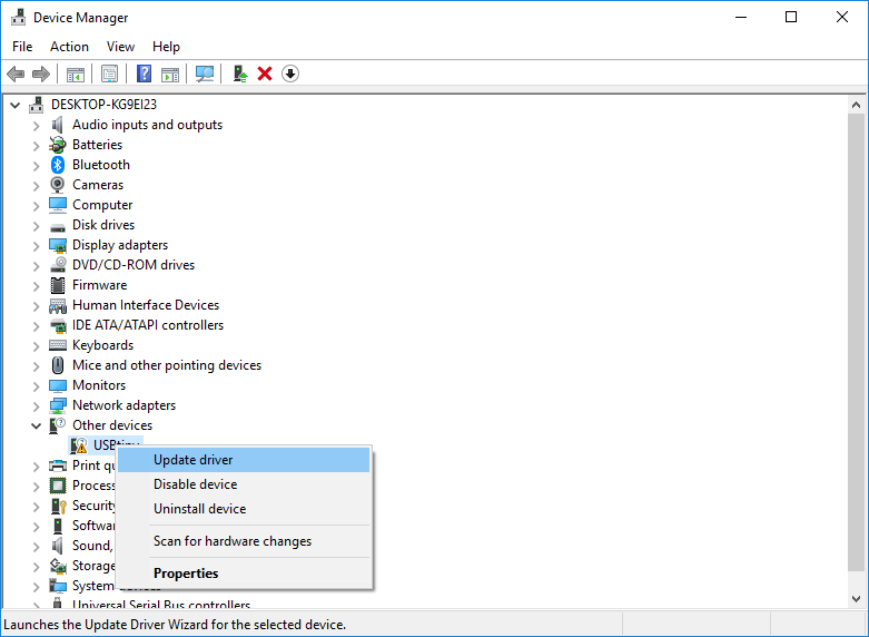 The Device Manager window should refresh and even with the Pocket AVR Programmer, the missing device driver should disappear.