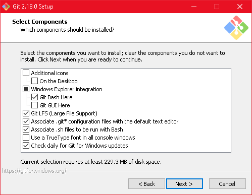 Selecting components. We do NOT recommend the Git GUI. Using the Git Bash CLI (command line interface) is how you shouild use git. We additionally added the Check daily for Git for Windows Updates.