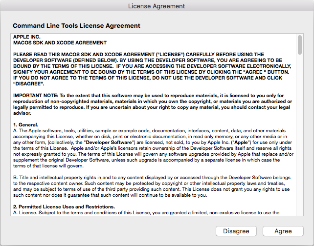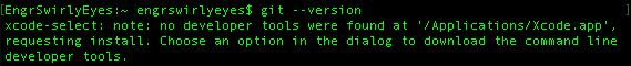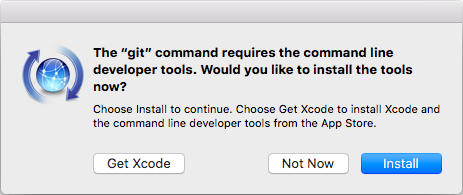 On the other hand, if you get the following response, then you need to install git - and your Mac will automatically take you through the process to install the command line developer tools.